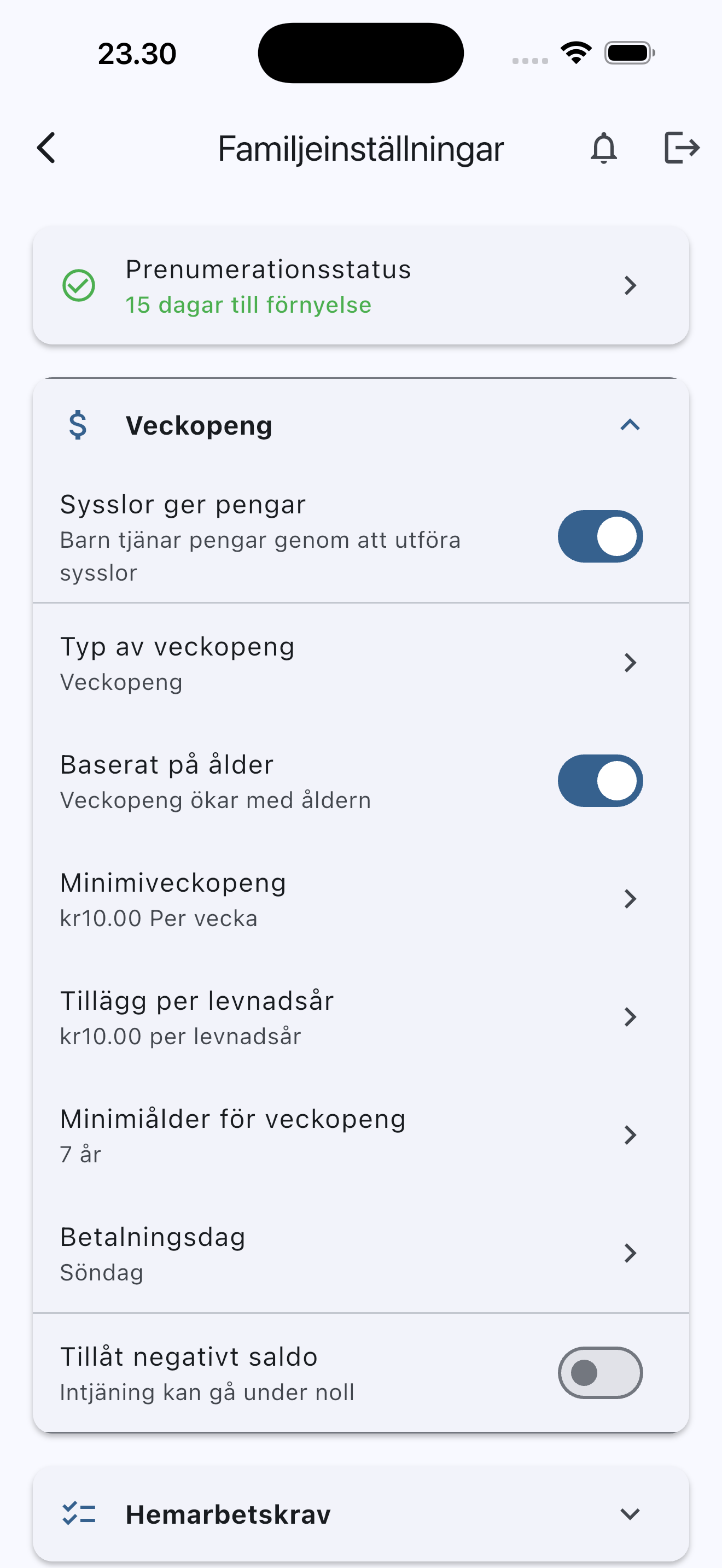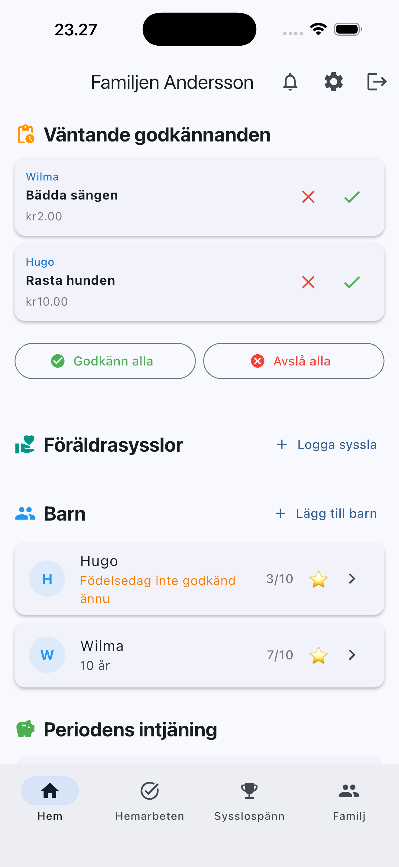 Du kan lägga till obegränsat antal barn i din familj. Varje barn får sin egen profil med personliga hemarbeten, veckopengsinställningar och sparmål.